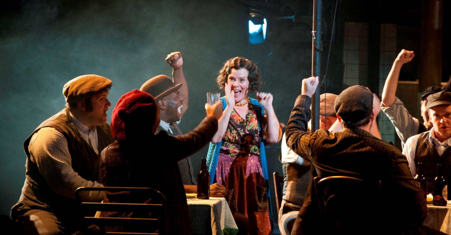 Mark Henderson’s genius smoky lighting fixes and focuses our attention as the action dots and darts about Anthony Ward’s splendidly grim industrial set, which gestures towards, perhaps, a semi-derelict warehouse, while his 1930s costumes update the original Victorian Sweeney to a Depression-era world, making sense of Mrs Lovett’s poverty, and the many drifting men who, unremarked, go missing after visiting the “tonsorial parlour”. Director Jonathan Kent keeps the complex action moving elegantly across the stage, using all three levels of Ward’s set to good effect as he marks out Sondheim’s shifting rhythms.