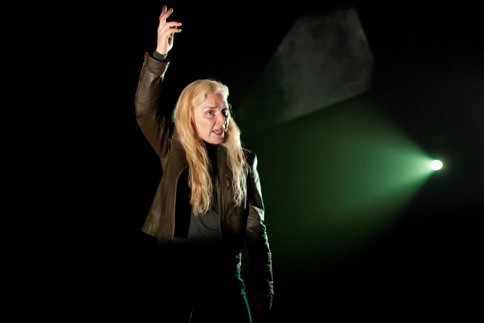 A darkened stage is framed by a huge broken mirror, three shards of which supply the discreet platforms on which A, B and C tell their tales. We start with A (Olwen Fouéré), a fortysomething Samaritan (pictured below) who recognises a caller as Helen, one of her ex-pupils. For no apparent reason she decides to save this young woman from her fate as she is in a relationship with a violent woman who wishes to kill the baby Helen is carrying. Next to speak is B (Catherine Walker), a lonely twentysomething who decides on a whim to join her best friend and her creepy husband on a night out, while C (Declan Conlon) is a shy man in his thirties looking for love.