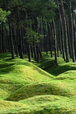The site is now covered with thick pine trees, and the huge mine craters, roughly eight metres deep and wide which occupy a one-time no-man’s-land, are grassed over and attracting the attentions of visiting schoolboys. Underneath these, however, is a network of preserved tunnels which helped the Canadian forces finally to take the area from the Germans. The tunnels were the influence behind Grindley’s compact staging.