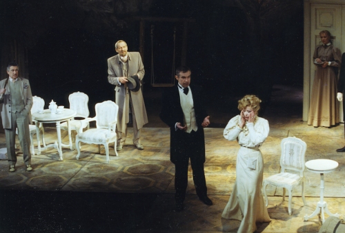 In Chekhov’s The Cherry Orchard (pictured above, with Marina Neelova as Ranevskaya, front), Volchek sees a conflict between generations which ends with an old order being despatched to history, while a new order arrives – itself very relevant at the time of its 1997 premiere. It was the third time that the director had staged the play at the Sovremennik, with a cast that shows off the theatre’s senior generation of actors at its very best.