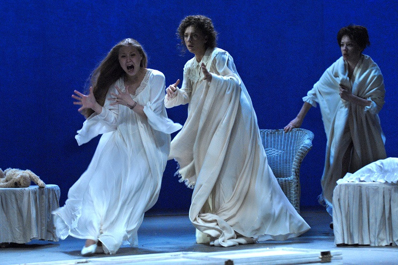 Other elements jarred — while Chekhov’s text emphasises the lack of good looks in Tuzenbach, one of Irina’s suitors, Shamil Khamatov is by any definition a handsome young man. Irina herself, though celebrating her 20th birthday at the start, never left off playing with her teddy through the years that followed. Again, I could not feel a necessary point about immaturity, since Victoria Romanenko evolved quickly to a far from childish Irina by the end. And why go against the text in the fire scene? All is clean and pristine, the sisters in angelic white (pictured right), and Vershinin hasn't a smut on his uniform, despite his comments about being so dirty from his heroic acts. These aren't contrarinesses that I could make any sense of.