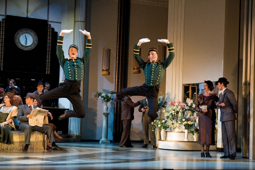 There’s a 30-strong cast and a 16-piece orchestra, spiritedly directed by Dan Jackson. The staging captures the glamour and glitz of the Thirties, with lots of Art Deco hotel rooms and seamless transition from location to location. Designers Hildegard Bechtler (sets) and Jon Morrell (costumes) recreate in fine detail those heady days. So, it looks good and it sounds good. The ensemble numbers, especially dancing the Piccolino on the Venice Lido and together-tapping “Top Hat, White Tie and Tails”, are terrific, as you might expect with Bill Deamer as choreographer.
