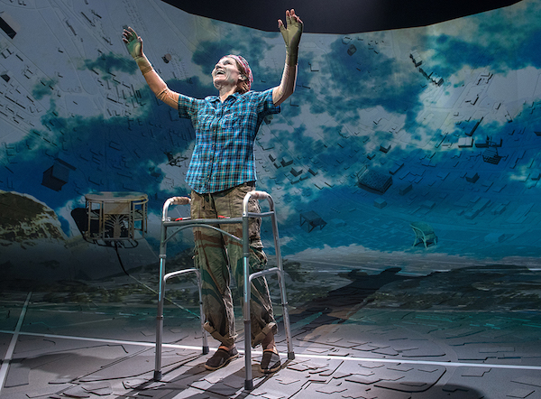 Jess’s therapy requires immersion in a snowbound world of virtual reality (pictured above), while her therapist leads her through the process of constructing an environment strong enough to distract her body from the feeling of constant pain. Kate Fleetwood delivers a bravura performance as the agonized vet, her stiff puppet-like movements gradually thawing as she learns to appreciate the humanity of those around her. She convincingly communicates the wariness that results from extreme pain, and her anger feels genuine. In one moving moment, she changes into a dress, determined despite the difficulties. It is typical of a thoroughly touching performance. She gets good support from Ralf Little (Stevie), Olivia Darnley (Kacie) and Kris Marshall (Kelvin).