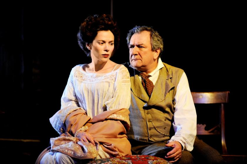 Anna Friel – a shattering porcelain beauty – is Yelena, young wife of Paul Freeman’s pompous, biliously bitter and ludicrously vain retired professor Serebryakov; Ken Stott is Vanya, the brother of Serebryakov’s dead first wife, who was mother to Laura Carmichael’s mousily squeaking Sonya. Pale, exquisite, Friel has a brow that cannot resist arching sarcastically and wears a determined social smile belied by eyes that are often bright with unshed tears. Stott’s Vanya bubbles with stymied energy, twitchy, a painfully self-aware clown whose hand jiggles restlessly in his trouser-pocket, anxious to grasp at life as it slips by, but never reaching for any real achivement, as if acknowledging the cruel truth in the words of his mother (Anna Carteret), whose undisguised disappointment is matched only by her preference for her son-in-law Serebryakov over her own son: “You should have made an effort. Then you might have got somewhere.” Vanya's doglike devotion to Yelena is only intensified by her appalled rejection; he feeds hungrily on the bones she tosses his way, even as they sicken him.