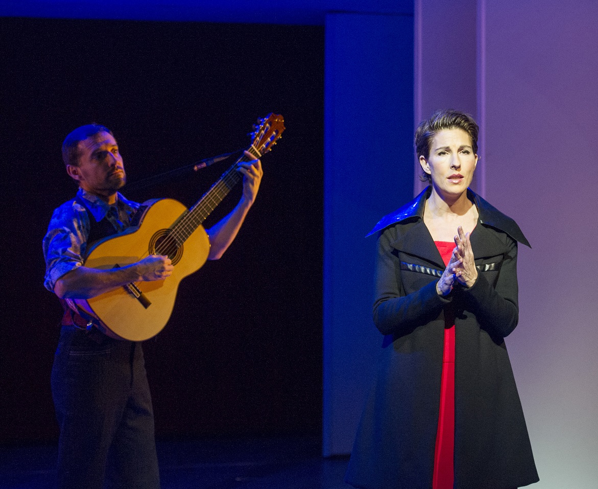 The conceit is niftily established when our anti-heroine Pepa (Tamsin Greig) staggers sleepily onto Anthony Ward’s sleek duplex set and affects a series of double-takes at the presence of a band and a whole bunch of unlikely bodies going nowhere fast. A female matador with a blackboard indicates that we are in Madrid (just in case the assortment of English accents should later throw us) and we are furthermore in the midst of Pepa’s “Dream”. Or should that be nightmare? There’s a singing taxi driver with a guitar – the excellent Ricardo Afonso (pictured below right, with Tamsin Greig) acting as a narrator/balladeer in the manner of Che in Evita – and since he has a Spanish accent and no one else does we start to buy (or not) the fact that nothing is going to be quite as it seems here. That anarchy (and, yes, there’s even an Islamist terrorist – which is not good timing) is bound to rule.