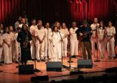 At the start or her show, the white-robed singer Ganavya does something unusual: while other performers usually warm their audience up before suggesting they sing along, she plunges straight in, a minute or so into chanting “a love supreme”, and gets everyone to join her in what can only be described as a communal act of devotion. This is a kind of high-wire daring, and it works, suggesting as well that she's assured of a large group of listeners for whom she can do no wrong.