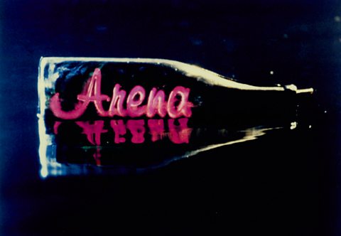 Francis Bacon offered us tea or other refreshment in his chaotic studio, Eric Sykes wrapped up his computer in plastic after another long day in the office, and we paid a visit to one of the three conventions per year of the George Formby Society in Blackpool, watching masses of men of all ages plucking the banjo under a screen of vintage film of George Formby plucking the banjo. Jack Nicholson appeared in his dressing-room while making The Shining, and informed us that he always brushed his teeth before work to make it easier on his fellow actors. Peter Blake welcomed a masked and utterly silent Japanese wrestler into his home to pose, and Sister Wendy defined humanity as people who prayed. (Message in a bottle: the Arena logo, above.)