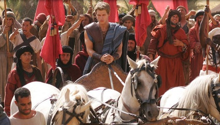 The two leads were pretty weedy for a start. As Judah Ben-Hur, Joseph Morgan (pictured above in chariot) wouldn't have looked out of place onstage with Westlife, but never fully shouldered the burden of taking on the entire Roman empire, becoming an instant expert at chariot racing and pausing to give the poor, bloodied Christ a hand as bestial Roman soldiers lashed him towards Calvary. He wore the permanent look of a man who has had to make too many 5am starts and was just going where they pointed him.
