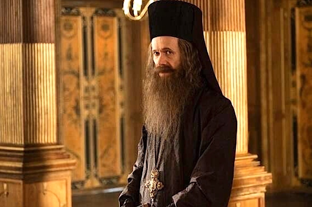 Peter is an unhinged monstrosity, recklessly drunk and violent, obsessed with fornication in its most primitive forms and shooting animals, or people if he feels like it. He presides over a court of grovelling yes-men, women who are treated as inanimate objects, and the sinister, bearded Archbishop (Adam Godley, pictured below) who lurks Rasputin-like in the background. Hoult’s portrayal of Peter walks a tightrope between black-comic absurdity and murderous nihilism, as if Ken Russell had given the script a quick once-over.