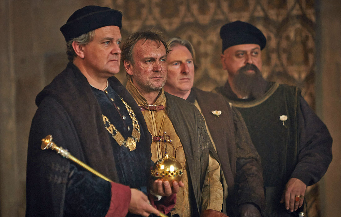 Meanwhile, at front and centre, the groundwork for the forthcoming horrors of the Wars of the Roses was being laid. It made you wince to see poor Henry VI (Tom Sturridge, another Shakespeare newbie), a well-meaning but weak and indecisive shoegazer type, being battered between the rival power factions, too naive to realise the implications of picking up Somerset's red rose and not the white one brandished by Adrian Dunbar's Plantagenet. His solution to the pair's simmering resentment and dynastic ambitions boiled down to telling them to play nice together. (Pictured above: Hugh Bonneville, Philip Glenister, Adrian Dunbar and Stanley Townsend)