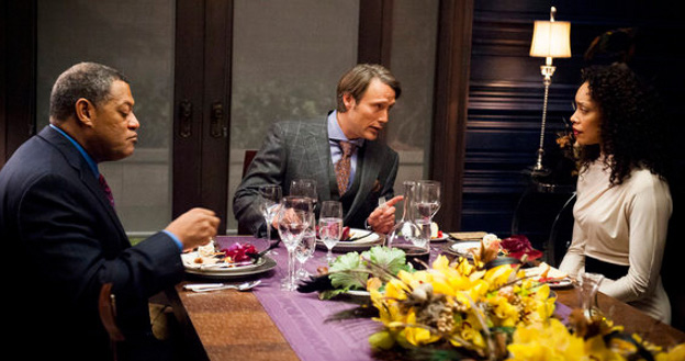 In this fifth episode (subtitled "Coquilles"), Lecter entertained to dinner Jack Crawford, head of the FBI's Behavioral Science Unit, and his wife Bella (dining chez Lecter, pictured below). "Cold foie gras and warm figs. Delicious," said Crawford (Laurence Fishburne) appreciatively. When Bella declined to eat foie gras because it's a product of cruelty to animals, this prompted a pedantic diatribe from Lecter about ethical butchery and why there's "no need for unnecessary suffering." Doesn't being buried alive under a landslide of ham-fisted irony count?