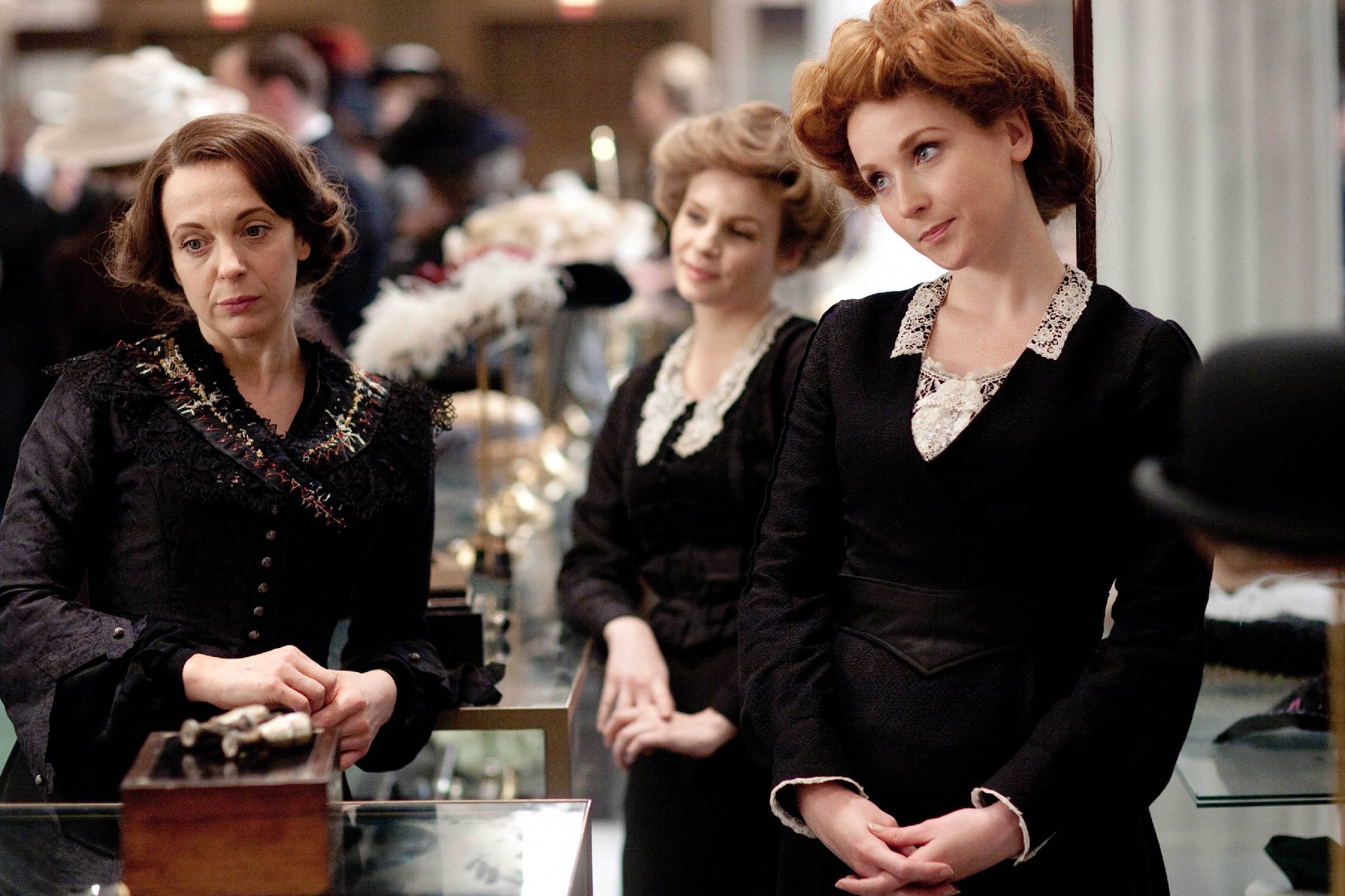 The last female in the web spun so far around Selfridge is shop girl Agnes Towler (Aisling Loftus, pictured left on the right), whom he encounters in the very first scene at the glove counter of a typical English shop where everything is hidden away - and his perceived effrontery in asking for it all to be shown to him duly earns Agnes the sack.