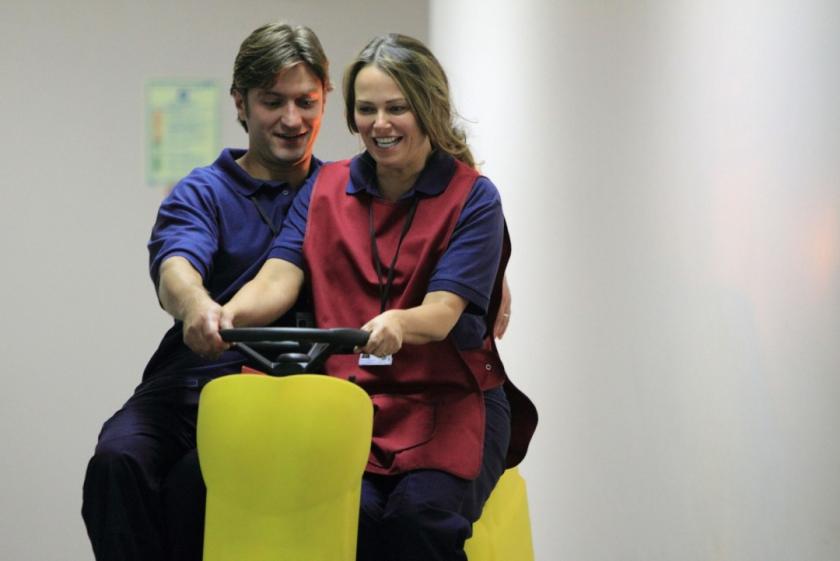 So it's a drama about the dramatic but rarely dramatised lives of the mothers and children, girlfriends and wives of men in jail. Each has her own complex relationship with the business of deceit, or of self-deception. Haywood is profoundly touching as a mother who can’t connect with her son, while Rigby (pictured right) weeps believable tears as an innocent terrified by the new world she’s been plunged into. But the tone is too flexible. Last night’s script didn’t quite have the oomph to put Franny through the ringer. All brass in the first episode, here she took the confiscation of her creature comforts a little too blithely on the chin, striking up a swift flirtation with a charming co-worker which, featuring a romantic ballet of motorised hospital floor-cleaners, bordered on the risible (main picture). The writing’s pursuit of light relief from the grimness often seemed to have wandered in from another department altogether. Somewhere inside Prisoners’ Wives there is a riveting drama about isolation and female self-reliance itching to get out, but it feels as if there have been too many prison visits from box-ticking script consultants. It should have done more time in solitary.