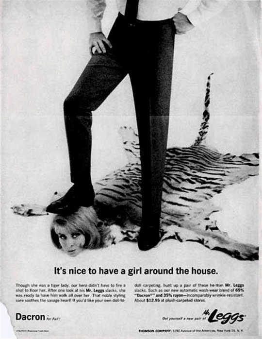 For much as we love him, Draper (Jon Hamm) represents the old world, in which his attitude to his wife Betty (January Jones) is playfully represented by Fifties ads where a man in Dacron "Leggs" slacks rests his foot on his prone girl's head (see pictures below). Peggy (Elisabeth Moss) is one of those renegades who live in a newly emerging world, who isn't afraid of female sexuality and would kill anyone who wrote the Pep vitamins ad (it was probably Roger Sterling).
