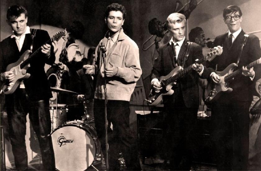 Marvin and Bruce Welch met as 17 year-old Geordies, attending the same school – a crowd had gathered around Welch as he played his guitar. Marvin – “who looked even more like Buddy Holly than Buddy Holly” – was impressed. They swapped chords and songs and soon they’d formed a skiffle group. The Railroaders as they called themselves adventured down to London for the finals of a national competition. They came third, and the theatre manager found them a bed for the night – a kindly Geordie woman who made them sandwiches and allowed them to camp out for six months. Immediately, they discovered Soho’s 2i’s coffee bar, “hot, sweaty, fun” and so crowded that a new dance was invented – the hand jive. There they met up with house drummer Brian Bennett. Fortuitously they were all hanging out when Cliff’s manager came in recruiting for a tour.