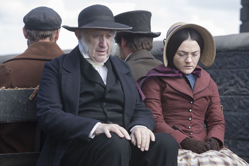Ironically, part of the sisters’ original motive for becoming professional novelists was to secure their financial independence in case their father died (and the Church reclaimed the house, in that familiar nightmare of the pre-modern spinster), but the father outlived his wife and all six children, dying in 1861, aged 84. The film ended with Branwell’s death (followed a tragically short period after by Anne and Emily). To close there made dramatic sense, though a glimpse of Rev Patrick’s thoughts, as he looked back on a life crammed with triumph and tragedy, would also have been fascinating. (Jonathan Pryce with Finn Atkins, pictured below.)