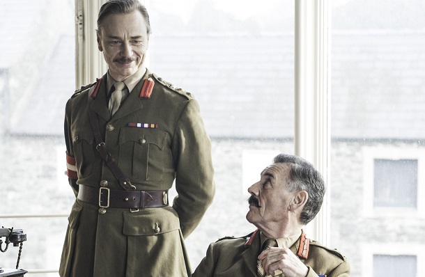 One of their popular objects of satire was, not surprisingly, the cushy lot that the general staff (the “stupid moustaches”) enjoyed well away from the privations of the trenches and the risks of actual combat. This prompted the apoplectic Lt Col Howfield (Ben Daniels) to cry downright insubordination, suggesting that all concerned should be be flogged (well, almost), but his rage was mitigated by his senior officer General Mitford (Michael Palin, seated, with Daniels, pictured below). An amiable old buffer straight from central casting, Mitford sloshed down the whisky but thought his lads should have their chance to let off steam; anyway, it was better than the response from the German side to trench warfare, a hymn of hate.