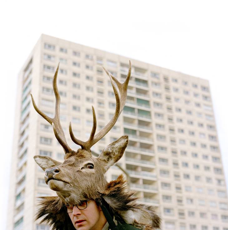 Marcus Coates (b. 1968) is an artist who specialises in projects that involve the natural world. Graduating from the Royal Academy School in the early Nineties, by the millennium he was attracting attention for filmed art events that were both eccentric and thought-provoking. These included Goshawk (1999), wherein Coates was suspended in a pine tree so that he might view the world as a bird of prey, the self-explanatory Sparrow Hawk Bait (1999), where he ran through a wood with his head covered in dead birds, and Indigenous British Mammals (2000), which saw him partially buried in wild moorland, performing a karaoke of bird songs.