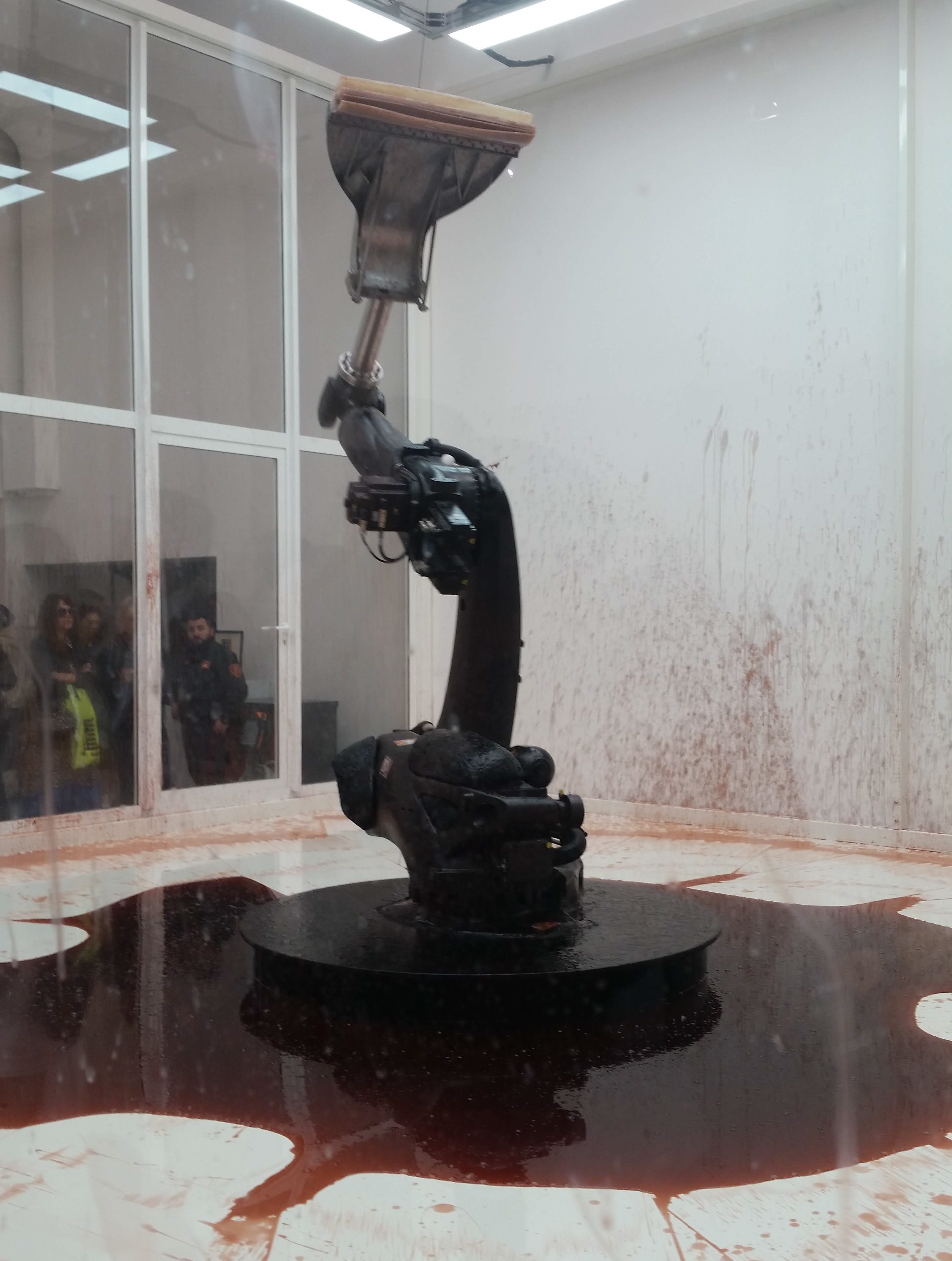 Paired works can also feel like lesser prototypes – for instance, the barely contained threat of Sun Yuan and Peng Yu’s overly powerful, occasionally helplessly indecisive machine arm delicately squigeeing red liquid into a Sisyphean pool (Can’t Help Myself, 2016, pictured right) far outstrips the whippy hissy fits of their marble-throned air hose installation made a year earlier (Dear, 2015). On the other hand, it sheds light on the development of their practice, which is in itself interesting.