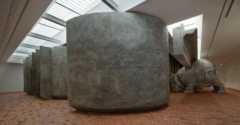 This forms a sympathetic milieu for the inaugural site-specific installation by the Argentinian artist, Adrián Villar Rojas. Rowed on shelves like objects from a fantasy museum Villar Rojars has created sculptures that suggest artefacts from some invented antiquity or imagined future. Drawing on an eclectic mix of influences from comic books to quantum mechanics, clay is the chosen medium in which he plays with notions of history, narrative, and modernity. And it was hard, among the crowds, not to feel some empathy for his huge elephant that, head down, seemed bent on escaping from the throng (main image).