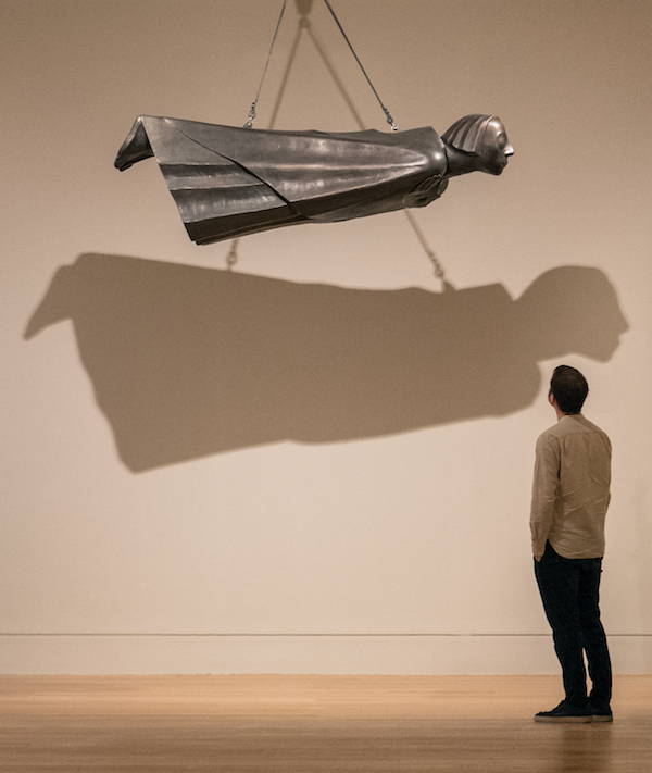 But even if the pre-war context of these artists lacks body, the afterlife of (particularly German) works tracks an interesting path through the exhibition. Ernst Barlach’s bronze, The Floating One, 1927/1987 (pictured right) was presented to Gustrow cathedral as a memorial for the dead but later melted down by the Nazis (the moulds were not destroyed and the bronze hanging from the ceiling was cast from these in 1987); Georg Schrimpf’s Swineherd, 1923, is quite sickeningly sweet but was admired by the Nazis for its obvious derivation from the German Romantic tradition. John Hartfield’s photomontage After Twenty Years!, 1934, juxtaposes a line of skeletons hovering like spirits above ranked children bearing guns in military formation, a sad and sinister image.