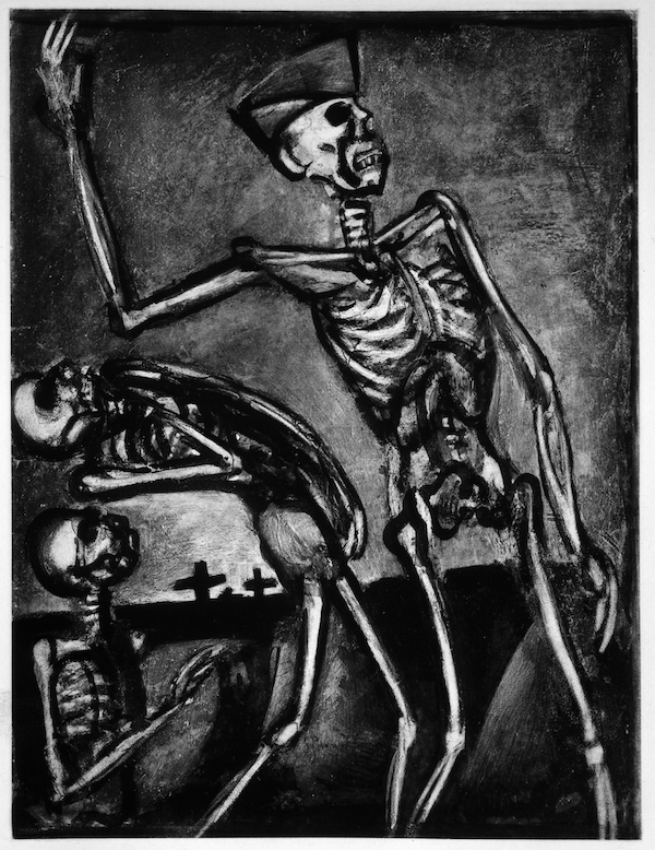 Beneath this hectic carnival remains threat. The swell of calm didn’t last long, and this is perhaps why the dark heart of the exhibition is a light-controlled room containing four print series, pyrrhic warnings against the repetition of horror on such a scale. Three line the walls (Max Beckman’s Hell, 1919; Käthe Kollwitz’s War, 1922; Georges Rouault’s Misery and War, 1927, pictured below) while Otto Dix’s magnificent print series War, 1924, takes up four vitrines set in a square in the centre of the room. The etchings draw from his own memories and, as a series, contain narrative possibilities that other pieces cannot. They move nimbly between registers – from realistic reportage to the deeply surreal – and for this they touch every aspect of the exhibition, from what happened on the battlefield to how people wanted to remember those years (and how they forgot them). Two depict without flourish, sentimentality or pity dead men up close; the ritualistic Dance with Death Year 1917 (Dead Man Heights), 1924, remains for all its gore carnivalesque; the fear graven into the eyes of pedestrians fleeing a street buzzed by a bomber is as direct as reportage photograph; while a moonscape of craters breaks into the gathered night, figureless and sterile.