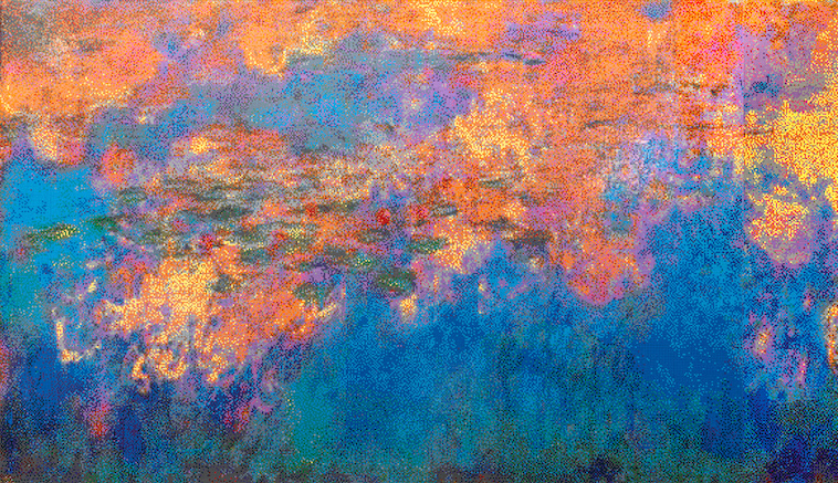 A whole wall is covered in a version of Monet’s 15m long triptych Waterlilies (1914-26) (pictured above: detail). Made with 650,000 studs of Lego bricks, the image is just about recognisable from a distance but, close up, all you see are individual plastic studs (pictured above left: detail of Lego Incident, 2014 discarded lego pieces). This mechanical replication of brushwork presages the increasing use of robots in advertising and elsewhere. Illustrators and designers are already being replaced by bots programmed to scan and cannibalise existing artworks. In the process, human creativity is rendered obsolete.