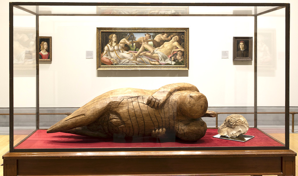 Cherri’s response to the event is interesting, but oblique. Reclining in a vitrine (pictured below) is the wooden carving of a female figure more akin to a prehistoric fertility goddess than a classical nude. Her bulbous body is covered in striations resembling scarification, but also recalling the lacerations inflicted on the painting. Its head – a 19th century marble carving – lies face-down on a mirror. Inset in one socket is a glass eye that peers accusingly at the viewer via the mirror, much as Velasquez’s Venus looks out of his picture via a mirror.