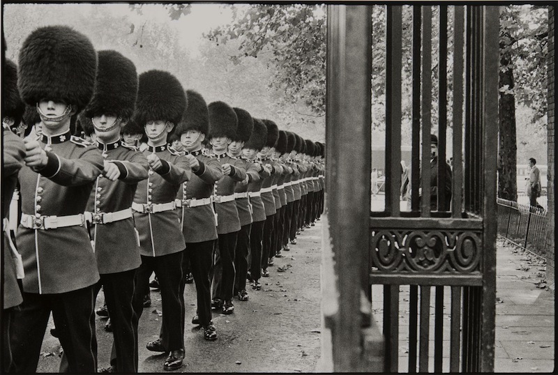 There are some surprisingly enchanting images. In 1926 the deliciously insouciant Jacques Henri Lartigue photographs his elegant wife Bibi in her high-collared fur coat strolling down the street, while behind an omnibus advertising Dow’s Port and complete with its outside staircase to the top deck trundles down the traffic free street. Yes, there are stereotypes but they are curiously refreshing: Hoppé shows us a pinstriped top-hatted young worker outside the Stock Exchange in 1937; Robert Frank can’t resist the workers, either, just one in a top hat, dwarfed by the monolithic becolumned buildings of the City of London (1952); Cartier-Bresson in an aerial view shows the workers going to their offices along the embankment (1951); and neither Laure Albin-Guillot in the 1930s nor Bruce Davidson in 1960 can ignore the marching formations of the Queen’s Guards (above: © Bruce Davidson / Magnum Photos).