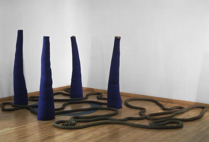 Next came a variety of sand-filled cones resembling tube worms from the murky depths; wobbly outlines indicate unstable contents, which makes their height and thinness even more impressive. Associations with the sea are strongest in an installation in which heavy rope winds between four bright-blue cones over a ring of blue lino shaped like a puddle. The presence of sand, canvas, ropes, bollards and shapes evoking water conjures thoughts of yachts and harbours, sea and sand.