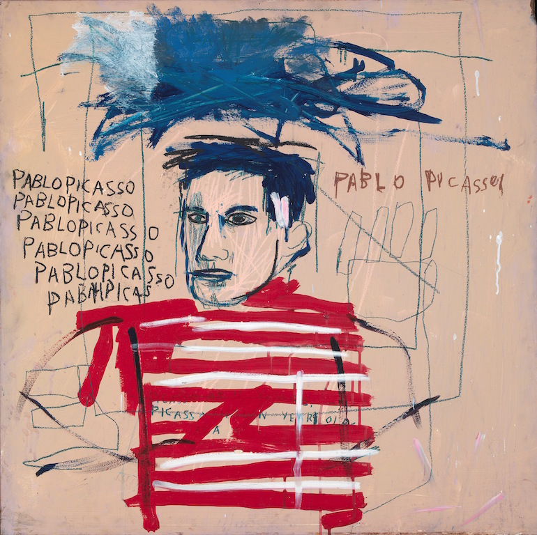 Surrounding himself with books on art, music and everything else besides, Basquiat remained a voracious consumer of images and information. In a clip from Warhol’s TV show he remarks that his paintings are about everything. “I get my facts,” he said, “from books, stuff on atomisers, the blues, ethyl alcohol, geese in Egyptian 'glyphs.” In pictures that are like stream-of-consciousness depictions of his current preoccupations, he obsessively lists things from car brands to metals, animals, the elements and the names of people he admired (pictured below right: Untitled Pablo Picasso 1984)
