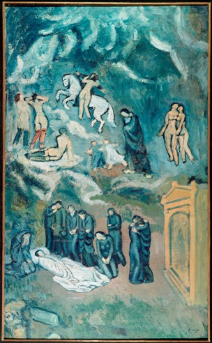 One of the major works on view is almost ludicrous, although shot through with both passion and hope. The fantastical Evocation (The Burial of Casagamas) (pictured below, Musée d’art moderne, Paris) is a painfully and poignantly sincere homage to the Spanish poet who was a close friend. The influence of El Greco is typically subverted. Its composition, a strong vertical with figures strewn through spac,e echoes traditional altarpieces without a trace of irony, including playing with proportions, making the scene both unreal and believable as a dream.