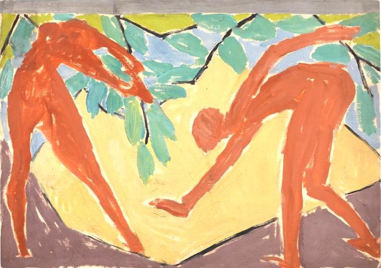 She clearly felt freer to explore abstraction in her designs than in her paintings. One of her most dynamic designs is a screen featuring Adam and Eve in the Garden of Eden, 1913-14 (pictured above). Inspired by Matisse’s The Dance 1909, it features the naked couple prancing about with unashamed delight in the freedom of their nudity. There’s no hint of shame and, perhaps more significantly, the man and woman are portrayed as equals, both involved in shaking the fruit from the tree. The exhibition began a much-needed process of reappraisal through which her contribution as an artist is being recognised once again.