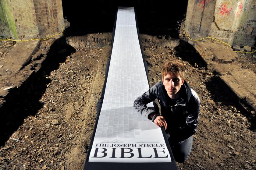 Steele had been waiting inside – not in a God-like throne, rather a hard hat. The chapel is falling apart, albeit beautifully, and even the challenger to Jesus Christ couldn’t avoid health and safety. BIBLE itself was on a table long enough to accommodate its full six-metre length of point seven type, looking really rather underwhelming.