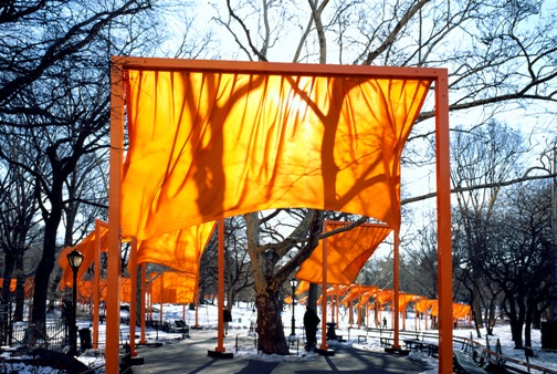 For the greatest joy of a Christo/Jeanne-Claude installation is the sheer sensual delight it brings. This can be seen in the photographs – the crowd around the wrapped Reichstag is not standing silently in awe, but participating. The Gates, in Central Park (above), made this even clearer. As the fabric flapped snappily over the park’s paths, rivers of art-lovers streamed underneath, each person creating their own parade.