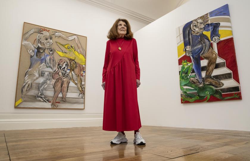 There is humour in plentiful evidence, among her paintings in this show. It’s in the billiard player stretching across the baize, seen from a crazy aerial angle in La Carambole Inspiré par un Burin de J. Minne, 1976. It’s in the suited figure climbing a staircase whose cramped posture appears caused by the top of the canvas Big Foot Small Head (for Thomas), 1985 (pictured above right). And it’s in the old-school journo photographing a murder scene with lofty detachment, Gardez Vous à Gauche, 1981.