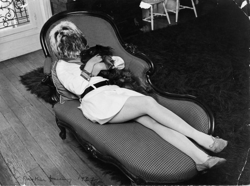 In Oh, Dorothea Tanning (1945) a newspaper clipping of a group of marching little babies is crumpled and torn suggesting a disdain for the role society is pushing the artist towards as a new young wife. Over 30 years later in works such as Mayhem with Tepee (1979) and Glad Nude With Paws (1978) the female body is dissected and anonymous, reduced to hips, tits and bums. In two collages from 1967, Dorothea Tanning With Her Smart Dog (pictured right) and Dorothea Tanning as a Dog (main picture), the faces of her beloved dogs are laid over human faces, resulting, respectively, in an image of a smiling girl next to her dog-headed companion on a swing and Tanning herself with a canine head reclining on a chaise longue. Again the manipulation in the collages is incredibly simple, but here they reveal a child-like sense of humour.