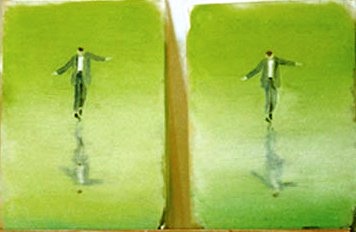 Alys_dj_vuDespite this, Alÿs’ work, and world, is one of infinite charm. His acrylic paintings, often semi-caricatured in style, have a comic edge, with the figures often looking like they wandered out of a Tintin book, even while they are unsettling – Déjà vu (left) is two identical small panels that show  a small gestural brushstroke of a man reflected in a puddle, sited in two different rooms: you see the first, wonder if the reflection is the déjà-vu element, then move on to other pieces; by the time the second pops up in another room, you have forgotten the title, and wonder if you have mistakenly doubled back. Déjà vu not a major piece, but that brief "ping" of uncertainty is achieved with remarkable wit and brevity. A different kind of wit, more pointed, a bit sour, was displayed as Alÿs’ contribution to the 2001 Venice Biennale (not on show here). Asked to participate, Alÿs signalled both his attitude to art-world display, and to his own pride, or otherwise, at being asked, by sending a peacock to represent him.