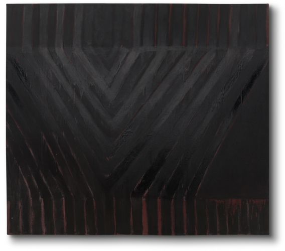 The first painting is in many ways the most stimulating: Delta (1958) (pictured left) is a series of chevrons whose ends extend up or down, all painted in black. Inspired by Jasper Johns's stripy works, Stella decided to work in the same way, except in anger he turned to black. Suddenly an exploration of colour fields turned into an investigation of depth. The chevrons alternate between glistening, sweating blacks which ask the viewer whether it is possible to distinguish different planes, foreground from background - the form of a traditional picture. (By this point in Abstract Expressionism, representation of an object is no longer an issue, Rothko, Newman et al having done away with that.) This is the question he would go on to answer, in varying ways, ever since.