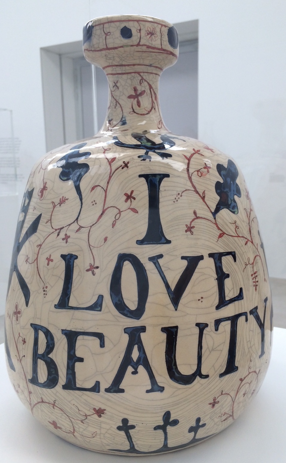 But then he abandoned film to concentrate on pots. For years, it was almost nothing but pots. The same hoary old cliché of “subverting” an apparently genteel craft with etched drawings of tough boys in pain, of waif-children in Victorian garb, of distressed mothers and affectless suburban dominatrices. Some of the pots are lovely – “I Love Beauty” (pictured above right) reads one wobbly urn painted with delicate tendrils in China blue and rose red on a white glazed ground – but the repetition is numbing.