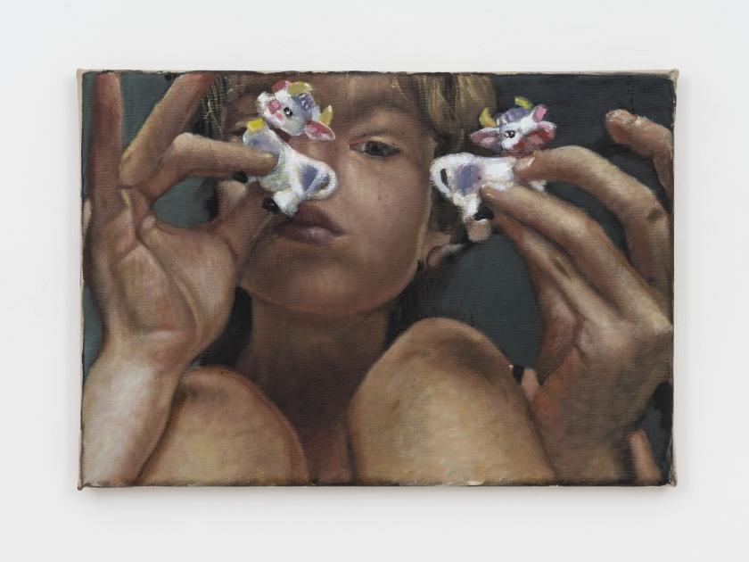Her remarkable painter’s skill – mostly oil on linen – is at the service of the hyper-realistic representation of everyday objects – the hardness of the material world – porcelain and silverware, the evocation of animals domesticated in near-kitsch figurines and tchotchkes as Wood calls them. These objects and possessions – the fragments of fashion items as well – are gestures designed to arrest time, enabling us to hold onto something impervious to decay and death, the harsh realities that nourish melancholy beneath the more bearable escape into the everyday. Time as well, the realm of Saturn, the god of dark times, is ever-present: Issy Wood is mad about clocks – or is it the passing of time that makes her a little mad herself?