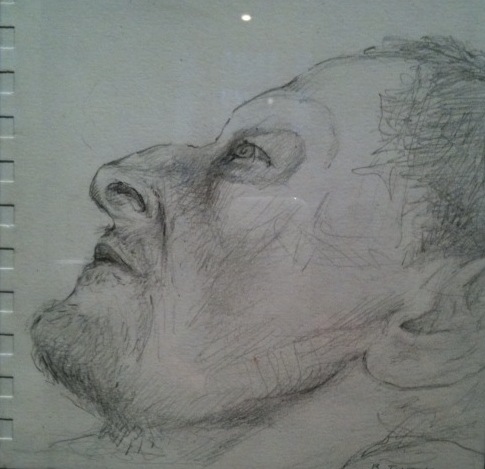 On an opposite wall, a series of further drawings and photographs portray Freud clearly approaching the end. In two drawings his flesh is drawn taut, almost translucent, and his gaze, once so formidably piercing, is milkily glazed over, turning onto itself. One is reminded that Freud had also painted his mother on her death bed, paintings in which her hands were often limply raised about her head. We see this gesture, denoting its state of infantile helplessness, repeated here.