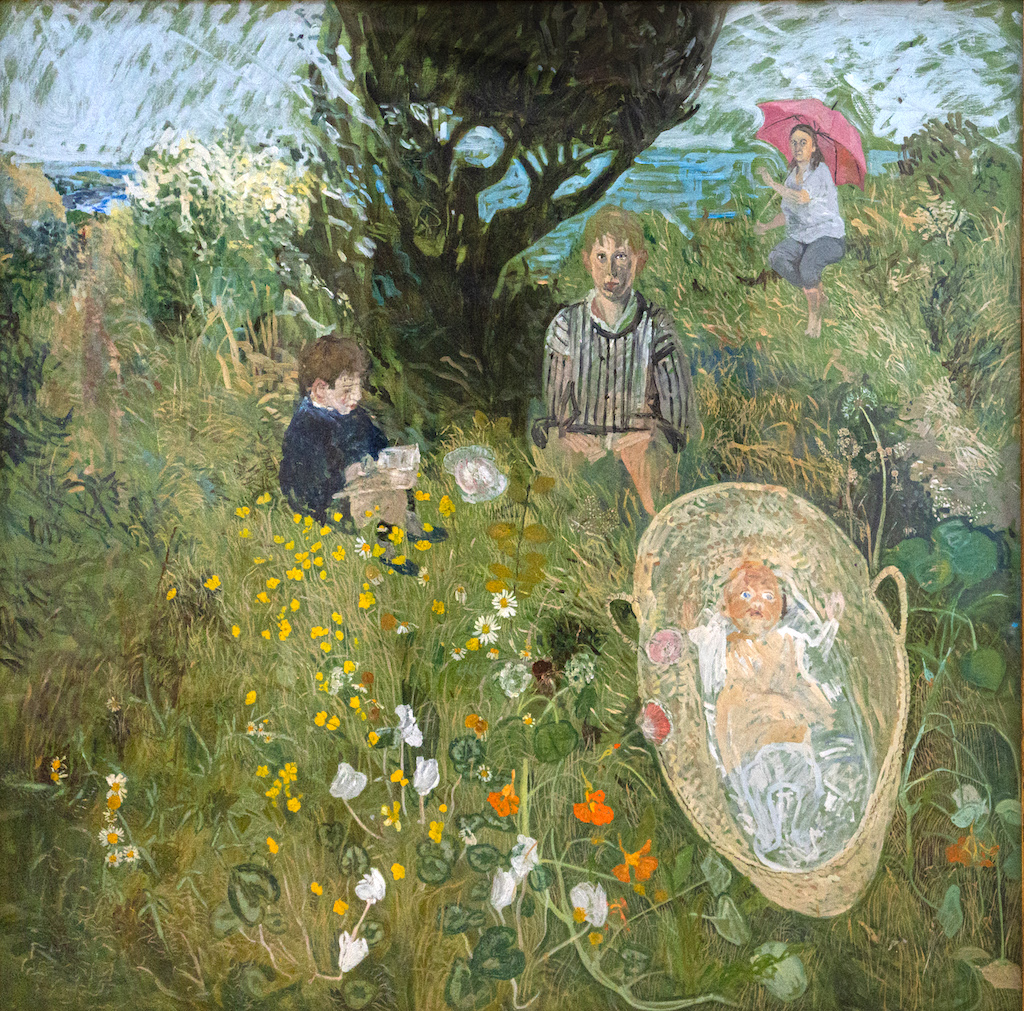 The dreamy atmosphere of Toujours en Fete, (Always on Holiday), 1969, pictured below, comes from the way the artist and her three sons are lost in their own worlds. Compiled from various sketches and memories, their meeting in this glorious garden has an almost surreal quality. Lying in his Moses basket, the infant seems to have dropped in from another dimension; Jason is absorbed in his book, while squatting in the grass, David is the only one to return the artist’s gaze. Perversely, though, Cooke can be seen at the back of the garden sitting under a pink umbrella on an invisible chair painting an invisible picture on an invisible easel, as though she too has been beamed in from another frame of reference.
