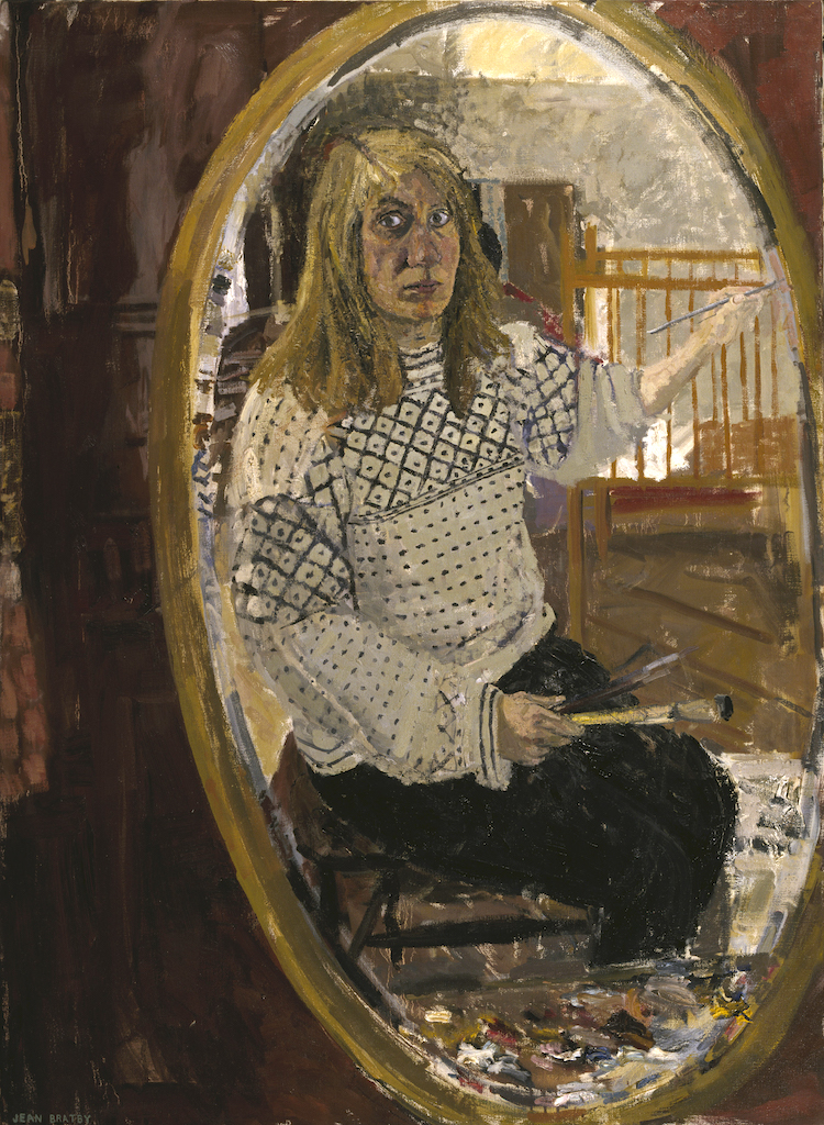 And yet her 1962 portrait of Bratby is surprisingly sympathetic. Wearing pyjamas and a dressing gown, he slouches in a chair lost in thought. The painting is beautifully observed and highly original. Filling the canvas, the serpentine curve of his body culminates in his large bare feet, from where one’s eye tracks up his legs to the hands and head. Despite recalling that she “was thinking that he looked like Bluebeard” as she painted him, with his hunched shoulders and hands crossed over his belly, she has made him look quite harmless.