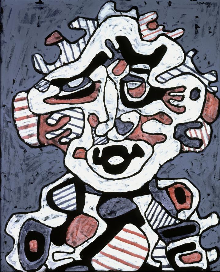 He broke down barriers between accepted canons of ugliness and beauty, which of course presents the paradox, visible at Pallant House, that his very tough art is not beguiling or alluring in conventional ways, but memorable and even mesmerising; he deliberately questions any classical notion of beauty. The purpose of art is to provoke and shock, he suggested by both statement and practice; “art speaks to the mind and not to the eye.” But Dubuffet makes sure the eye is drawn in, and cannot escape the characteristic impact made by his work. (Pictured right: Solario (portrait), 1967.)