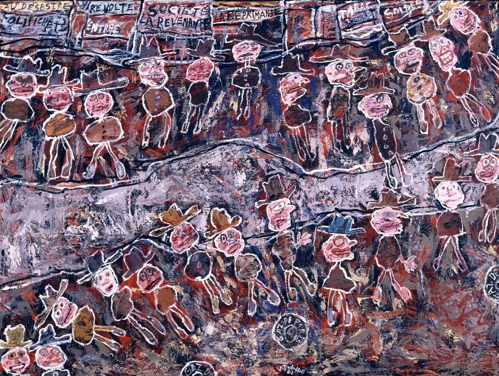 Spinning Round (pictured left) shows two crowds of rather sadly forlorn figures, huddled in various stages of desolation, perhaps anger too, separated by a greyish river or boundary. The dark Inhabited Landscape is certainly not a landscape much enjoyed by its inhabitants; it is also difficult to discern exactly what is happening in Nimble Free Hand to the Rescue, but perhaps the cheerily grotesque figures in Dubuffet’s characteristic palette are up to something good. He was indeed a puppeteer, creating figures called Hourloupes, meaning outsiders. More nightmare than dream, Dubuffet remains enigmatically powerful, pushing us in directions we might not want to take, showing us things we might not want to see, but somehow in his opulent astringency convincing us that these are worlds we ought to know about.