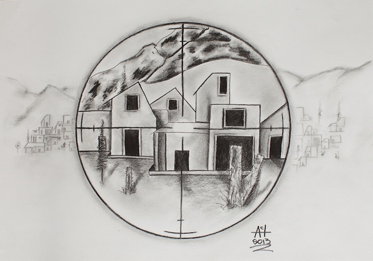 Hung on the stairwell, the banners lead you upstairs to a group of drawings (pictured right: Basra in my sights by Andy, HMP Everthorpe) made by soldiers who served in Iraq or Afghanistan, but are now doing time in Her Majesty's prisons. Portraits of Tony Blair, Dr David Kelly and Alastair Campbell – protagonists in the debate over the pros and cons of going to war against Saddam Hussein – are juxtaposed with scenes of army life which paint a dismal picture. Slumped on a bed against a union flag are two squaddies smoking crack at Wellington Barracks the night before deployment, while under another bed a soldier lies rigid with fear during an enemy attack in Basra.