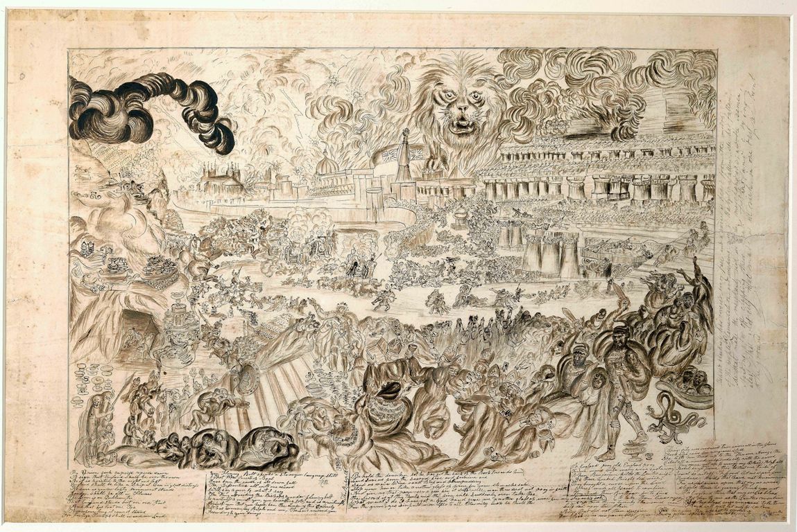 Part of the problem was precisely the success and popular acclaim: if the masses loved it, could it be art, worried the art world? And here, for the first time, we see the split between “high” and “low” appearing, the idea that if an art form was popular, it couldn’t actually be any good. Others merely suggested anyone that preoccupied with apocalyptic drama must be insane. This was fed by the fate of his brother Jonathan, who truly was insane, and whose legal defence Martin paid for after Jonathan attempted to burn down York Cathedral. (He ended up in Bedlam.) London's Overthrow (pictured left, by Jonathan Martin) included elements from many of his more famous and saner brother's work.