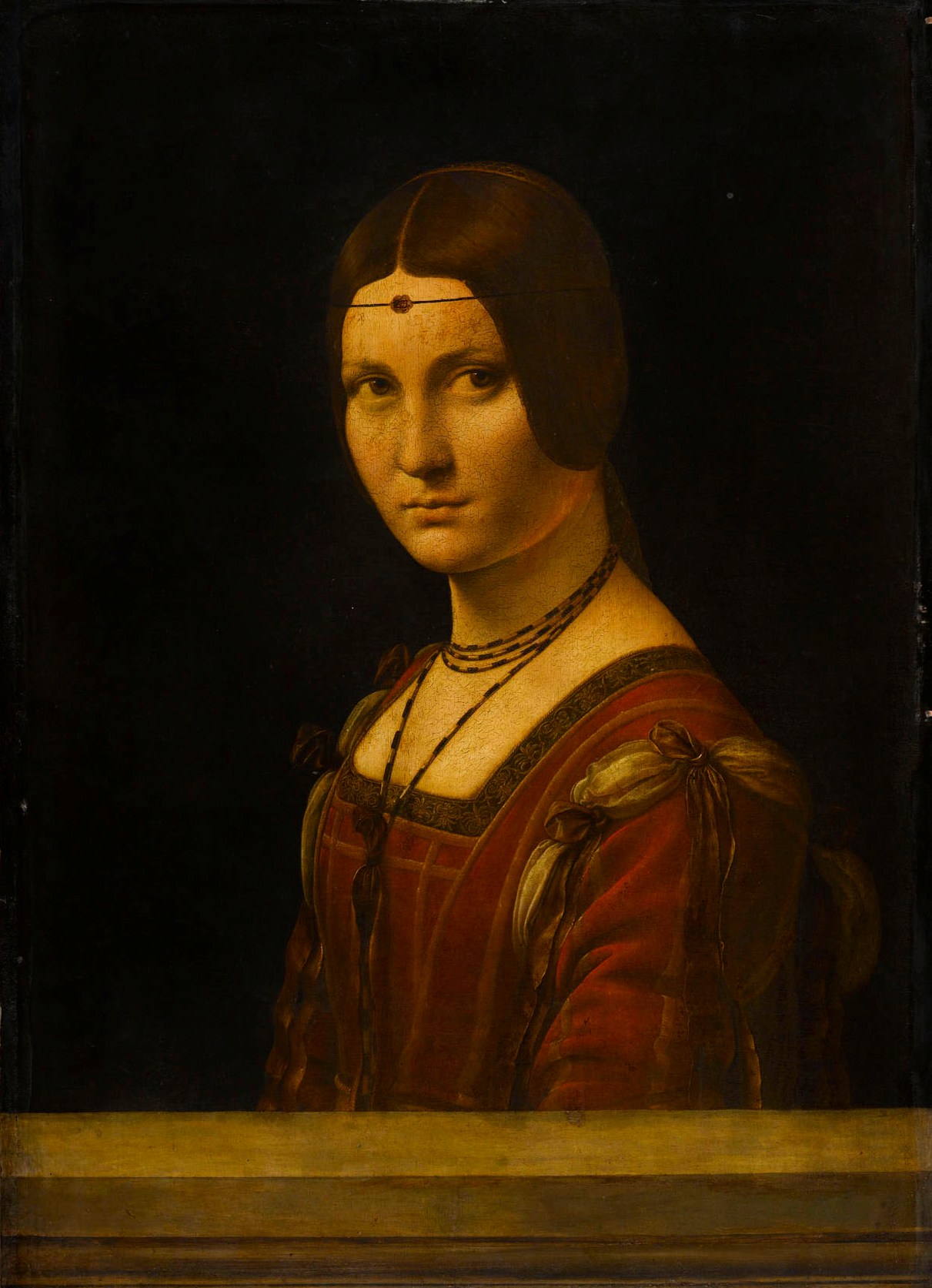 La belle ferronnière (1493-5) - so called because it was once mistaken for a portrait of the celebrated mistress of François I, but now thought to depict Lucrezia Crivelli, mistress to Ludovico - is depicted half-length. This is in keeping with all of Leonardo’s portraits (of which only five are known). She is distanced from us by a parapet, and the whole picture speaks of both distance and detachment. Her compelling gaze seems at first to hold ours, yet peer closely and you’ll find that she is not really interested in us at all, but is looking somewhere just beyond us. She is rendered with incredible attention to texture and light, with the modelling of her face executed with great subtlety, but hers is an idealised, almost generalised beauty.