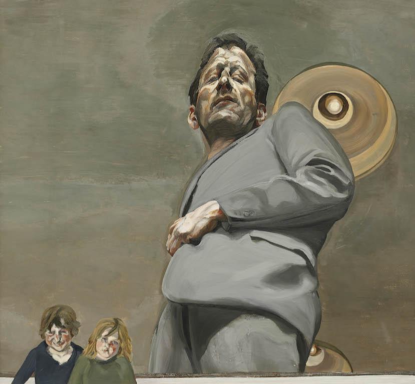 This was the last painting Freud made sitting down and switching from fine sable to hog’s hair brushes, which could handle much thicker paint, allowed him to develop a much freer, less linear style. The clarity of the early work gradually gives way to a more painterly approach, yet emphasis on painting as an act of voyeurism still remains paramount. By inserting himself into his portraits of other people, Freud continually reminds us of the triangular relationship between artist, sitter and viewer.